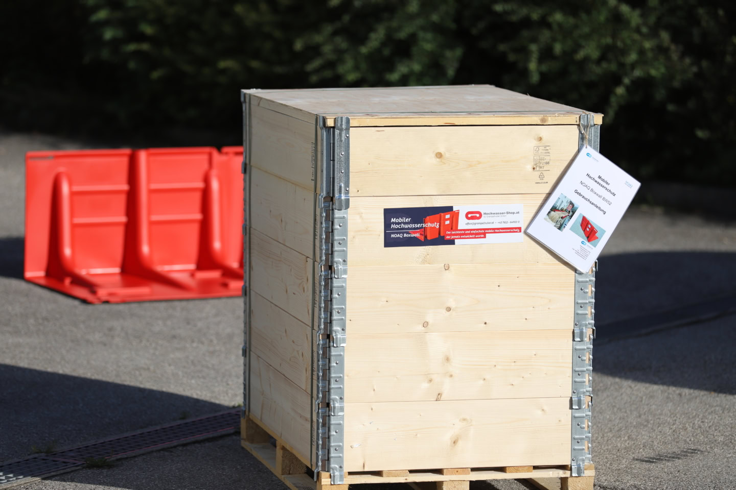 «NOAQ Boxwall» ist ein freistehender, mobiler Hochwasserschutz. Dem «NOAQ Boxwall» liegt ein innovatives Konstruktionsprinzip, nämlich die Verankerung und Stabilisierungen ausschließlich durch das Gewicht des ansteigenden Wassers (“Buchstützenprinzip”) zu Grunde. Dieses Prinzip erlaubt es, die einzelnen Elemente der Konstruktion extrem leicht auszuführen. Die Stauhöhe beträgt bis zu 50 cm. Die Länge des Schutzwalls lässt sich sich beliebig festlegen. Dank des geringen Gewichts, der extrem leichten Handhabung und eines einfachen Verbindungsmechanismus lässt sich ein «Boxwall» Hochwasserschutz – auch von ungeübten oder wenigen Helfern – schnell und effizient errichten, um beispielsweise Gebäude, Straßen, Plätze, Gewerbebetriebe, Tiefgaragen usw. vor Überflutungen zu schützen. Der NOAQ Boxwall ist für den Einsatz auf festen und ebenen Unterlagen wie Straßenbelägen und Betonböden geeignet, sowohl bei langsam ansteigendem wie auch bei schnell fließendem Wasser. Auch auf Rasen, unbefestigten Untergrund usw. ist der Einsatz technisch möglich. In diesem Fall kann der Boxwall mittels Folien und Sandsäcken zusätzlich abgedichtet werden. Die einzelnen Elemente sind stapelbar und benötigen daher sehr wenig Platz für Lagerung und Transport.